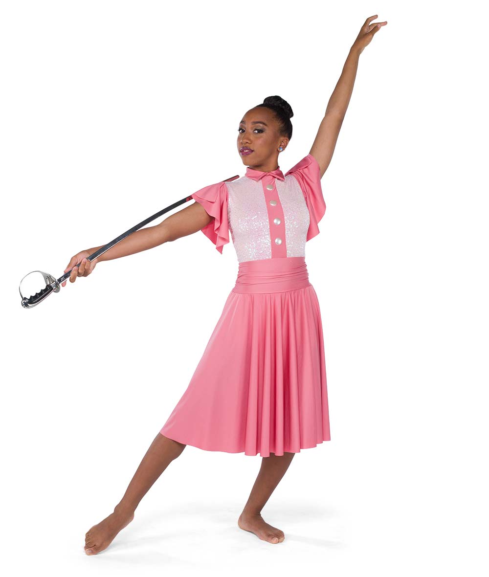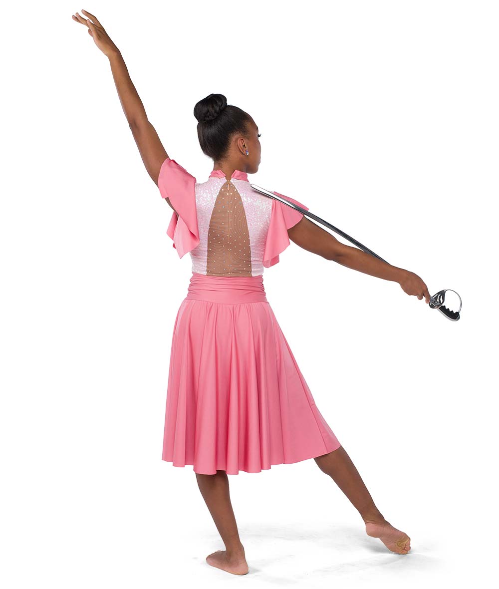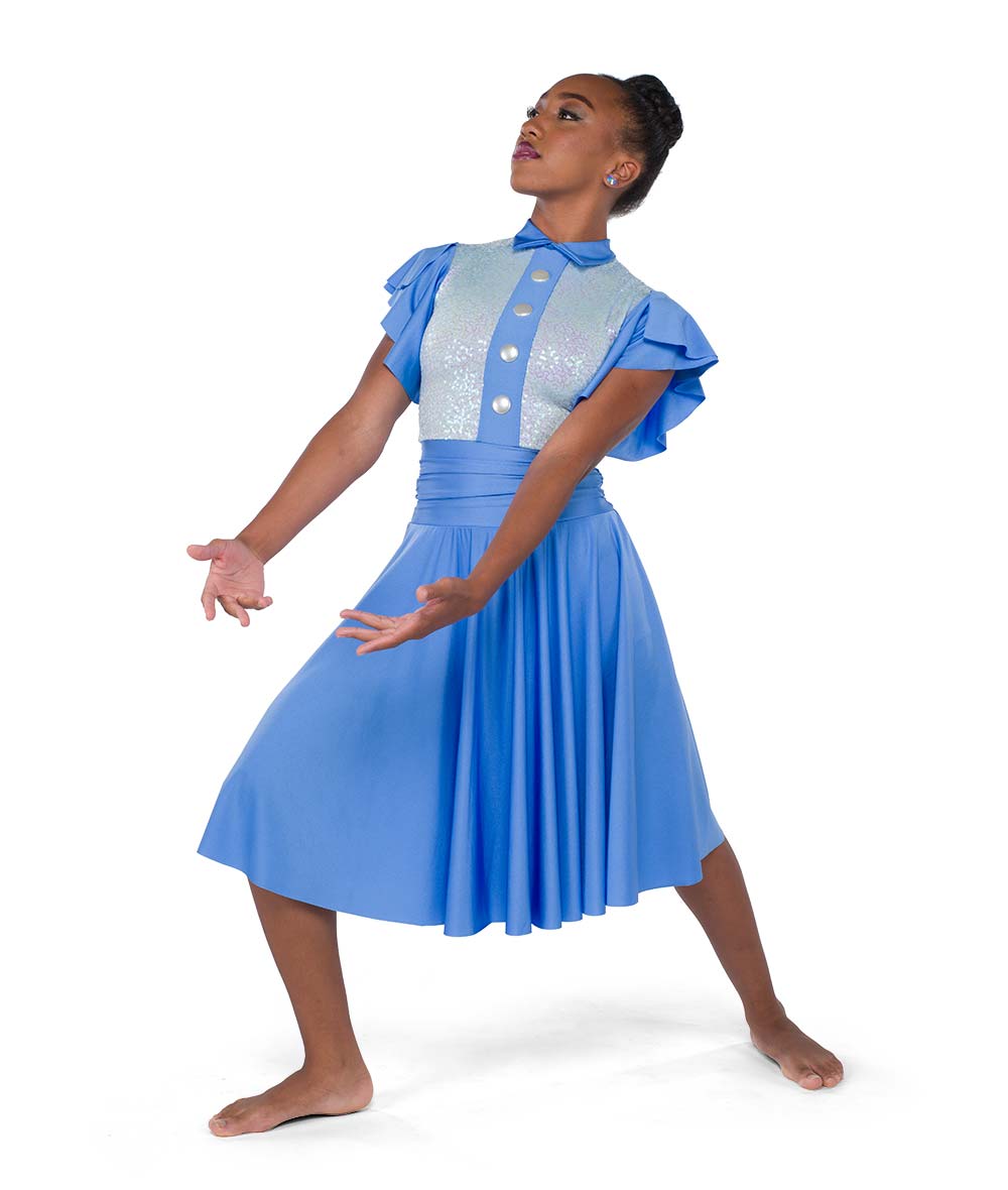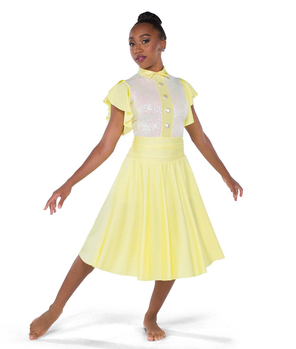 Lined sequin and solid spandex dress with flutter sleeves and lined sequin dot mesh back inset. Attached hot pants. Faux front buttons and zipper back. Made in the USA.